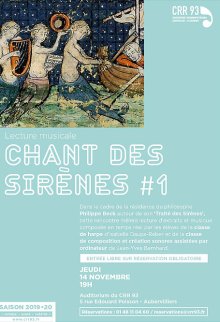 Laissez vous bercer par le chant des Sirènes, au fil de plusieurs rencontres, lectures musicales, projections, concerts, organisés dans le cadre de la résidence de l’écrivain et philosophe Philippe Beck au CRR 93. Première rencontre le jeudi 14 novembre.