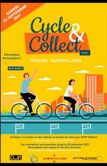 « Cycle and Collect » est un parcours à vélo entre Aubervilliers et Provins, qui s’adresse à des participants de tous âges qui s’engagent à cheminer et arriver ensemble à Aubervilliers en solidarité avec le Téléthon.