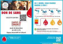 Le Campus Condorcet et l’Etablissement français du sang organisent un don de sang, jeudi 16 décembre, de 12 h à 17, à l’espace associatif et culturel.