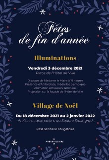 Vendredi 3 décembre à partir de 19 h, sur le parvis de l’Hôtel de Ville, Karine Franclet, Maire d’Aubervilliers, convie les Albertivillariens à assister au lancement des illuminations des fêtes de fin d’année, en présence d’Anita Blaze, médaillée olympique.