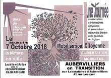 Le collectif Aubervilliers en transition organise le dimanche 7 octobre aux Laboratoires d’Aubervilliers, une journée de rencontres, d’informations citoyennes et associatives, autour des thèmes de la transition écologique.