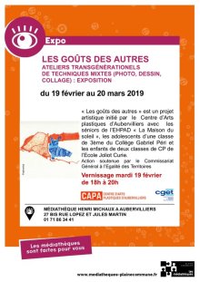 Le Centre d’Arts Plastiques d’Aubervilliers & la médiathèque Henri Michaux ont le plaisir de vous inviter à l’exposition des travaux du partenariat Les Goûts des autres jusqu’au 20 mars.