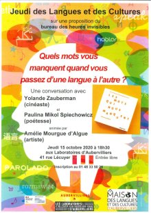 Conversation avec Yolande Zauberman et Paulina Mikol Spiechowicz autour de leur livre Les mots qui nous manquent animée par Amélie Mourgue d’Algue du Bureau des heures invisibles, jeudi 15 octobre, à 18 h 30, aux Laboratoires d’Aubervilliers.
