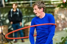 Il tortille des fesses, les lance, les fait rouler et à force de s’agiter devient aussi rouge qu’eux. Une pièce drôle et absurde dans laquelle la manipulation devient danse et la danse devient jeu. Un petit monde qui tourne en rond, tout simplement.