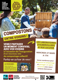 - Mercredi 27 mars de 17 h à 19 h (organisé par Plaine Commune) : Inauguration du composteur de quartier des Laboratoires. Au programme : présentation du composteur, inscription aux ateliers, distribution de bioseaux et apéritif convivial.
