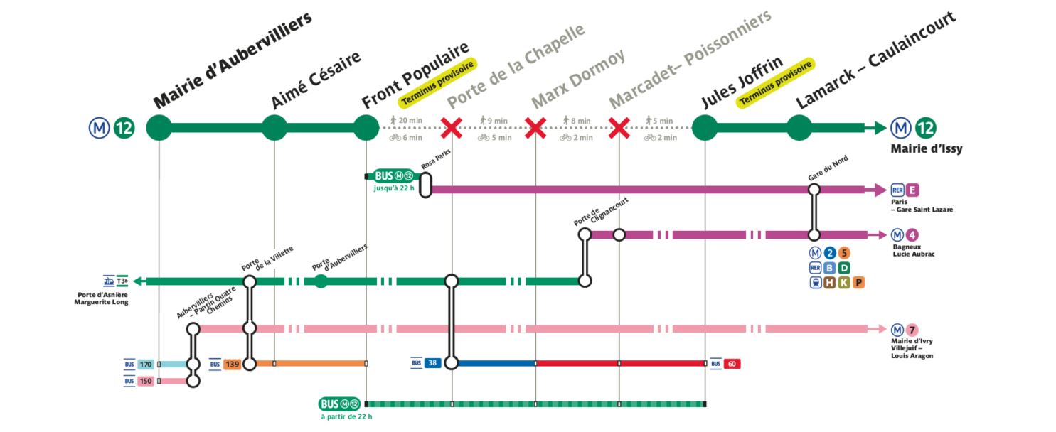 En raison des travaux de prolongement de la ligne 12, la circulation sera interrompue entre les stations Front Populaire et Jules Joffrin, du 2 au 8 août 2023 inclus.