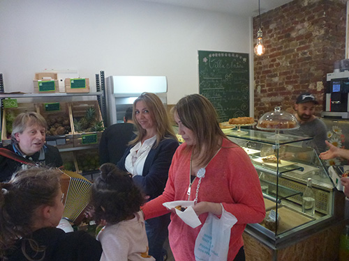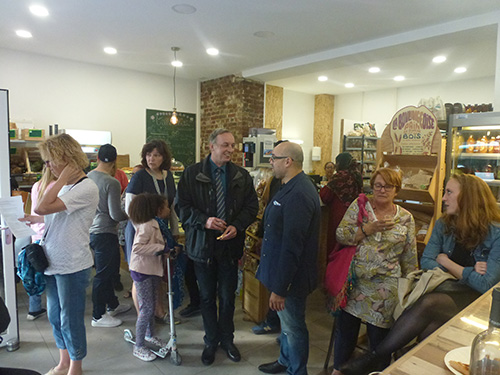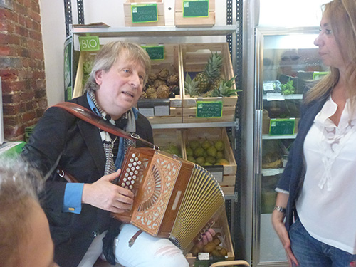 En musique grâce à l’accordéon vibrant entre les mains de Michel Pichon, on discute, on trinque... Chacun découvre les rayonnages de chocolat, thé, riz, épices, jus, vins, pain, fruits et légumes, etc., et le comptoir de restauration rapide avec ses salades, sandwichs, quiches, desserts, tous préparés maison.