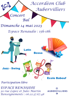 Le dimanche 14 mai de 15 h à 18 h, l’Accordéon Club Aubervilliers organise un concert-bal à l’Espace Renaudie.