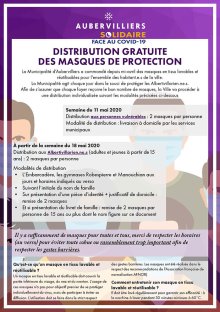 La Ville d’Aubervilliers distribue, à partir de la semaine du 11 mai, 2 masques à chaque personne vulnérable. A partir de la semaine du 18 mai, la distribution concernera les adultes et les jeunes Albertivillariens à partir de 15 ans.
