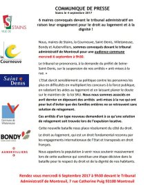 Nous, maires de Stains, la Courneuve, Saint-Denis, Villetaneuse, Bondy et Aubervilliers, sommes convoqués devant le tribunal administratif de Montreuil pour une audience commune mercredi 6 septembre à 9h30. Le tribunal se prononcera, à la demande du préfet de Seine-Saint-Denis, sur la suspension de nos arrêtés « anti-mises à la rue. »
