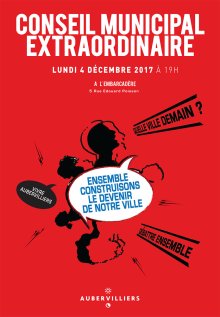 Parce que les rencontres citoyennes Vivre Aubervilliers !, organisées à l’automne 2016, ont montré l’importance que les habitantes et habitants accordent au devenir de leur ville, parce qu’il est essentiel de se projeter sur l’avenir d’Aubervilliers, la Municipalité vous invite à un Conseil municipal extraordinaire le lundi 4 décembre à 19 h à L’Embarcadère.