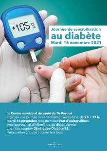 Le Centre municipal de santé du Dr Pesqué organise une journée de sensibilisation au diabète, de 9 h à 15 h, mardi 16 novembre près du métro Fort d’Aubervilliers avec la présence d’infirmières, de diététiciennes et de l’association Génération Diabète 93.