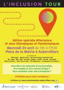 Organisé par la Mission Locale d’Aubervilliers, en partenariat avec la Municipalité et l’association Créative, l’Inclusion Tour fera escale mercredi 24 avril, de 15 h à 17 h 30, place de l’Hôtel de Ville, pour une édition spéciale alternance et Jeux olympiques et paralympiques.