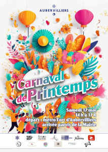 Venez déambuler dans la ville à l’occasion du Carnaval de printemps ! Les associations de la ville en partenariat avec la municipalité vous propose un grand défilé festif et coloré qui partira du métro Fort d’Aubervilliers à 14h pour arriver en musique sur le place de la mairie aux alentours de 16h.