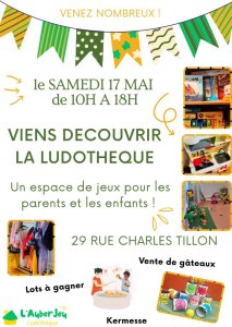 Venez fêter les 1 an de la ludothèque l’AuberJeu ! Le samedi 17 mai de 10h à 18h au 29 rue Charles Tillon. Au programme : jeux, lots à gagner, vente de gâteaux…