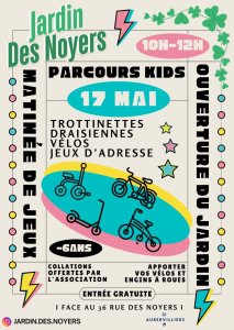 Le jardin des Noyers ouvre ses portes le samedi 17 mai pour une matinée de jeux : parcours kids, trottinettes, jeux d’adresse… et une collation offerte ! L’entrée est gratuite.