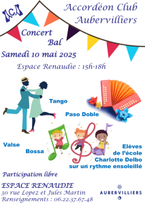 Le samedi 10 mai de 15h à 18h, l’Accordéon Club organisera un concert-bal à l’espace Renaudie. Cette journée sera organisée autour du programme suivant :