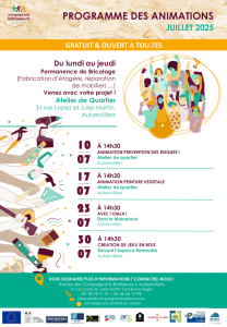 Retrouvez ci-dessus les actualités de juillet de l’atelier ainsi que le planning des animations pour juillet 2025 de l’atelier de quartier des Compagnons Bâtisseurs d’Aubervilliers !
