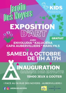 Jardin des Noyers : exposition artistique des ateliers de l’association Kaluciera / Envoludia et inauguration de la nouvelle cabane pour les enfants avec moment convivial. De 11h à 17h