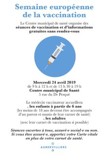 Le Centre municipal de santé organise, mercredi 24 avril, de 9 h à 12 h et de 13 h 30 à 19 h, des séances de vaccination et d’informations gratuites sans rendez-vous.