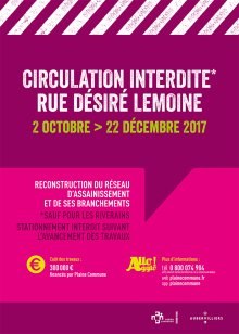 Du 2 octobre au 22 décembre 2017, la circulation sera interdite, sauf pour les riverains et le stationnement sera interdit.
