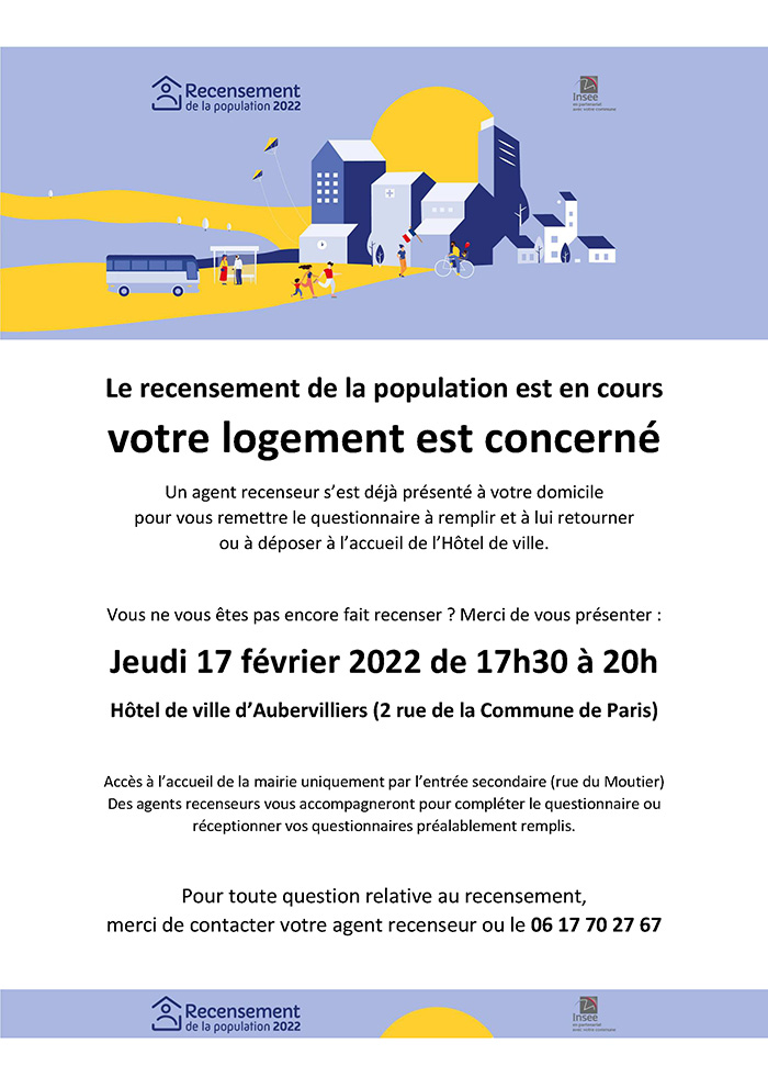 Toutes les personnes concernées seront informées par courrier qui expliquera les modalités du recensement. Les agents recenseurs passeront entre le jeudi 20 janvier et le samedi 26 février 2022.