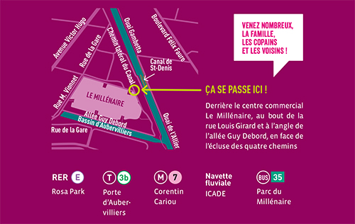 Rendez-vous derrière Le Millénaire, au bout de la rue Louis Girard et à l’angle de l’allée Guy Debord, en face de l’écluse des quatre chemins